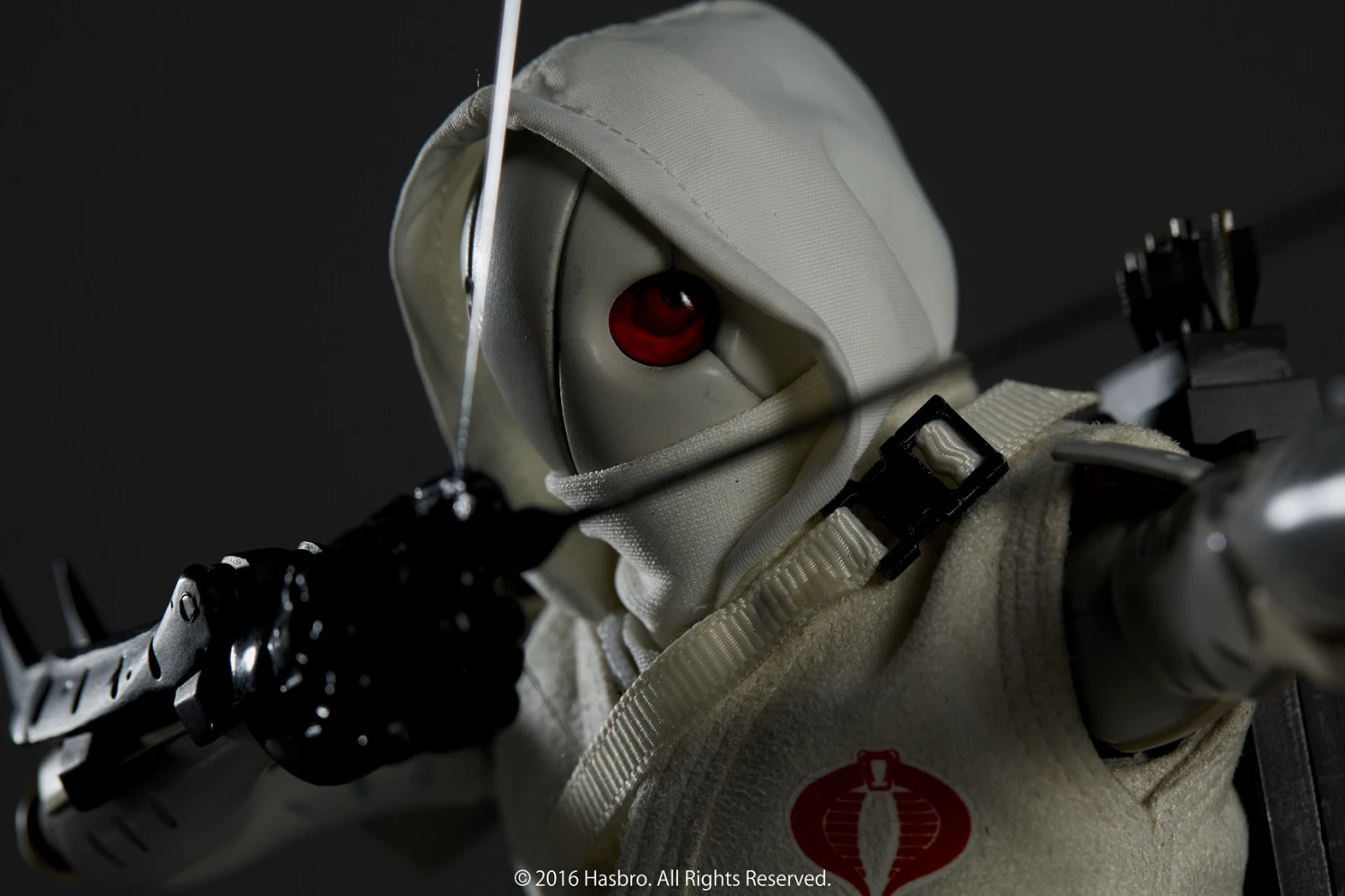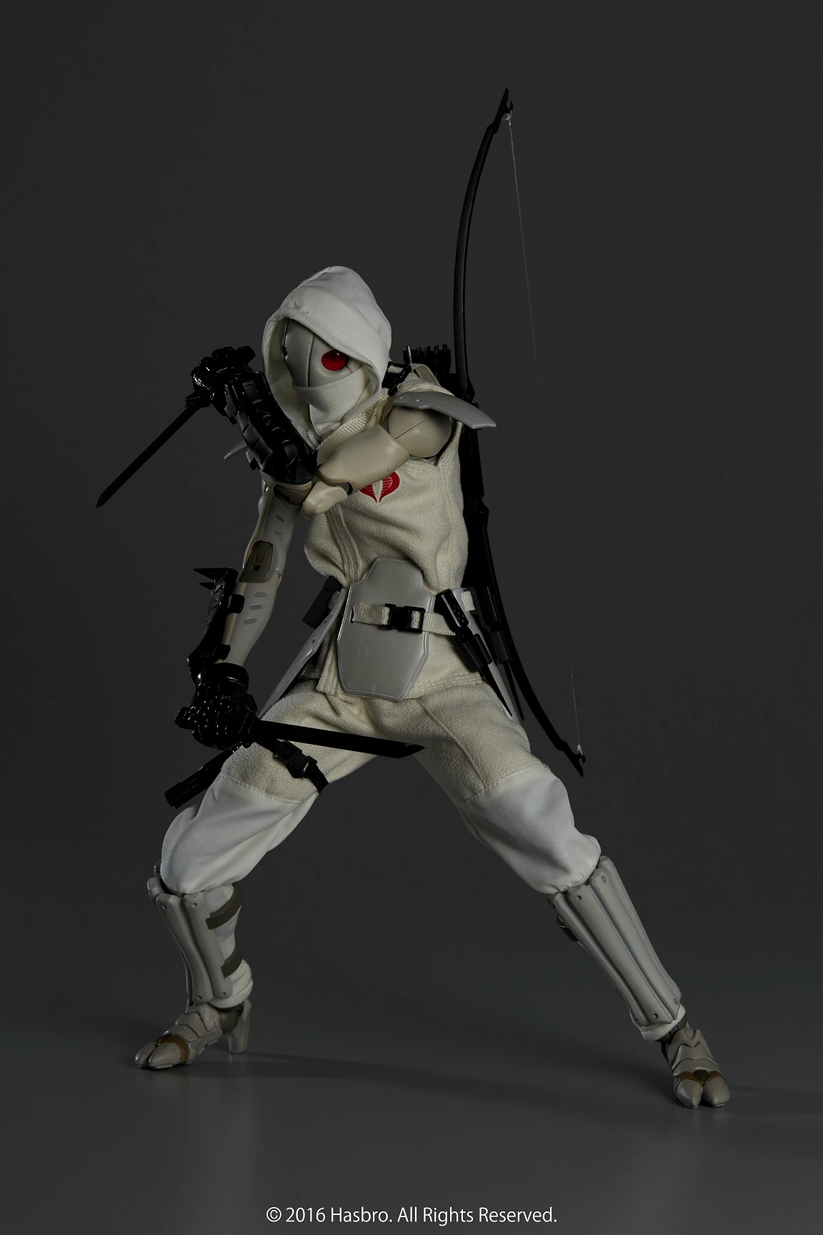 From 1000 Toys. The second collaboration project with BAIT is none other than Storm Shadow, the arch enemy of Snake Eyes, in the same G.I.JOE × TOA Heavy Industries style! In his white ninja garb which symbolizes ‘death’, Storm Shadow ambushes Snake Eyes who was in the midst of a rescue mission. His left eye glistens from under the mask, and slowly draws the bow towards his old arch enemy. Includes interchangeable hands (x2) and weapons.