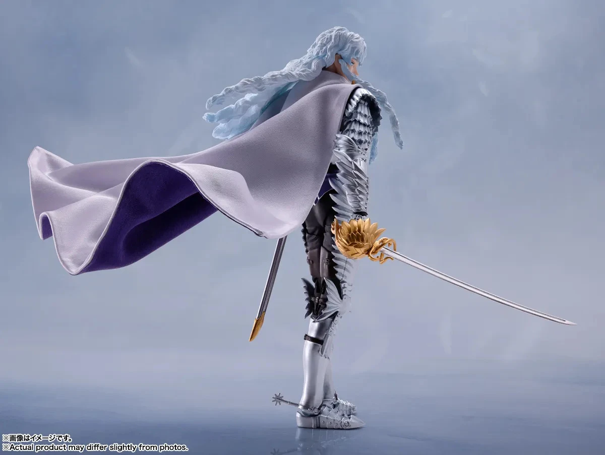 “For my dream… I will not lose this fight!” From the dark fantasy “BERSERK” comes GRIFFITH, leader of the Reborn Band of the Falcon, with his mighty steed in a gorgeous set. His armor and weapons are all faithfully detailed and colored, letting you display him in dramatic poses from the series. His helmet can be removed, and the visor is hinged.