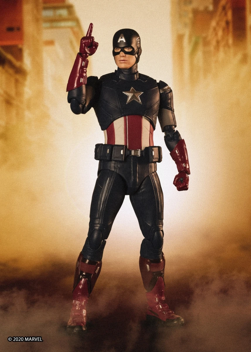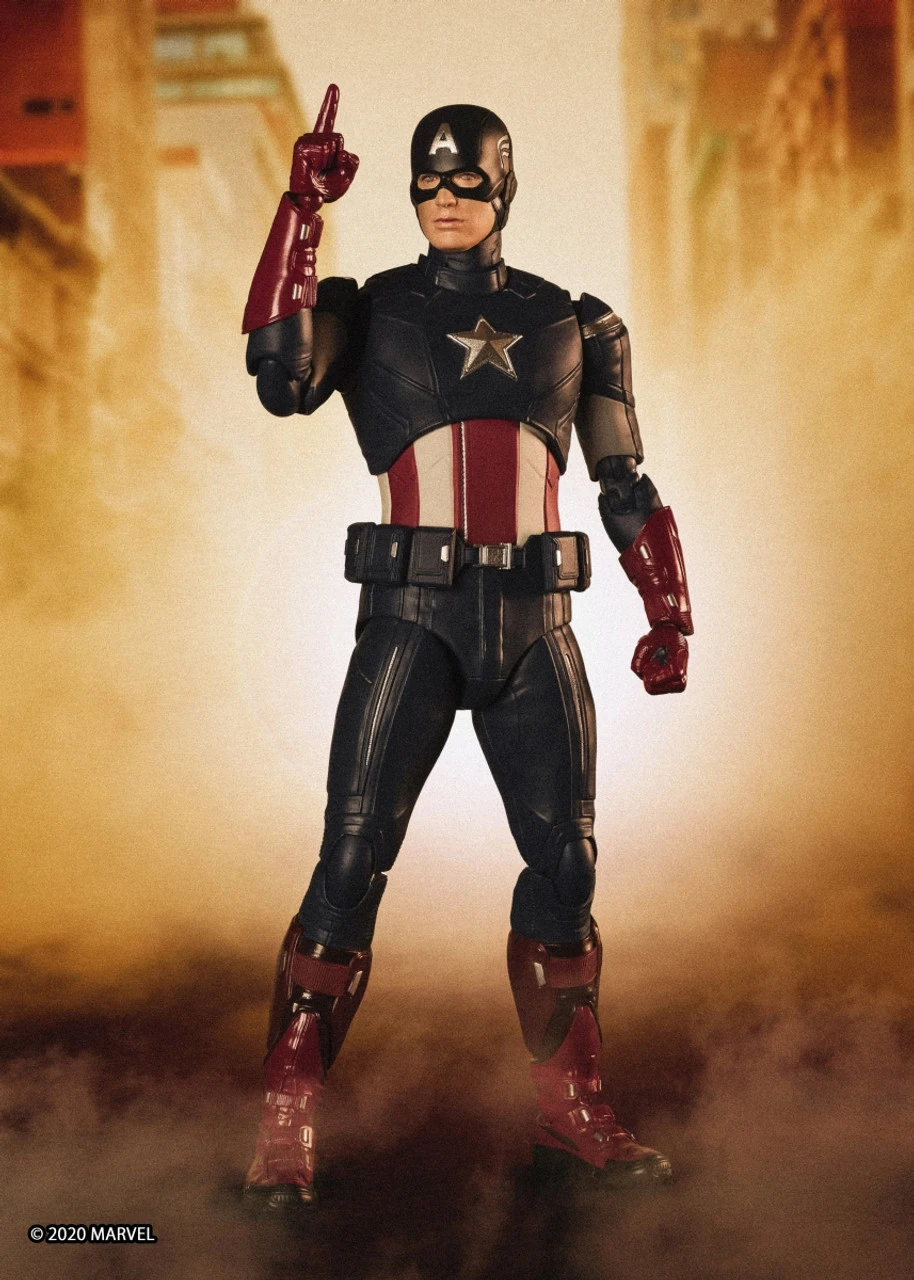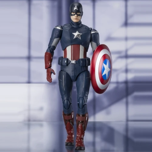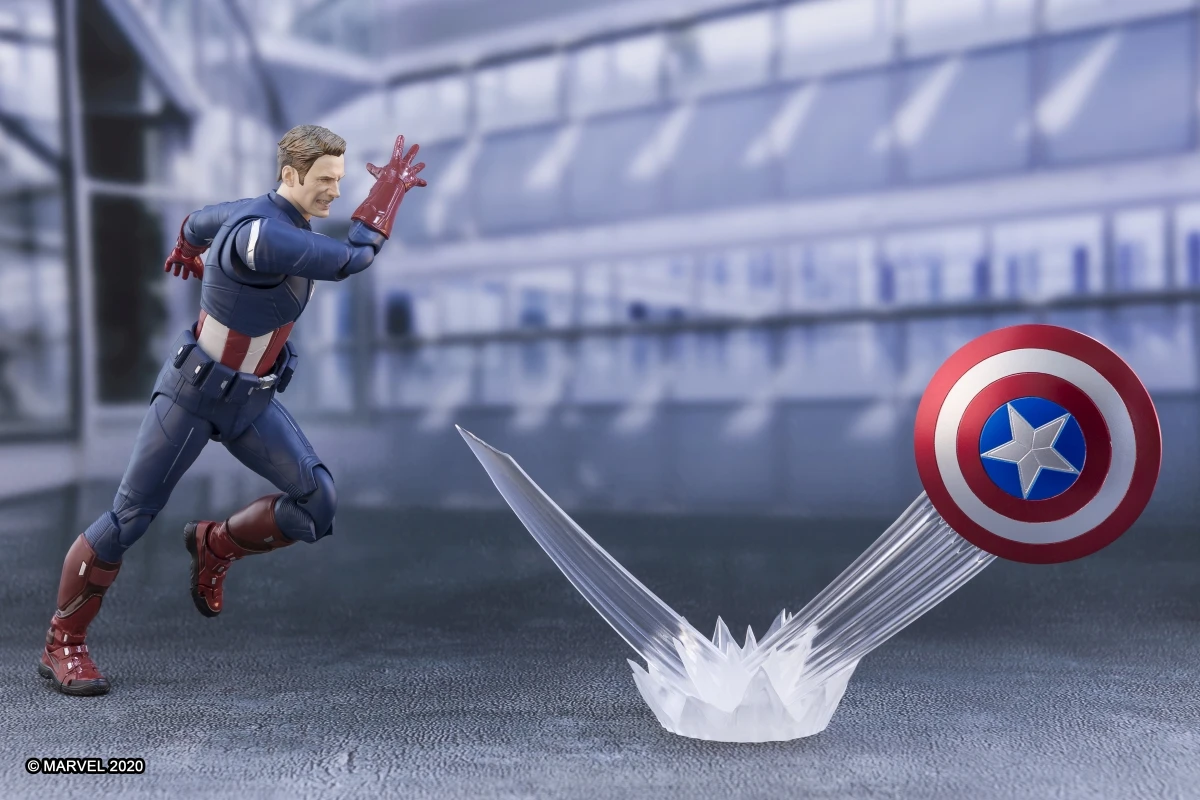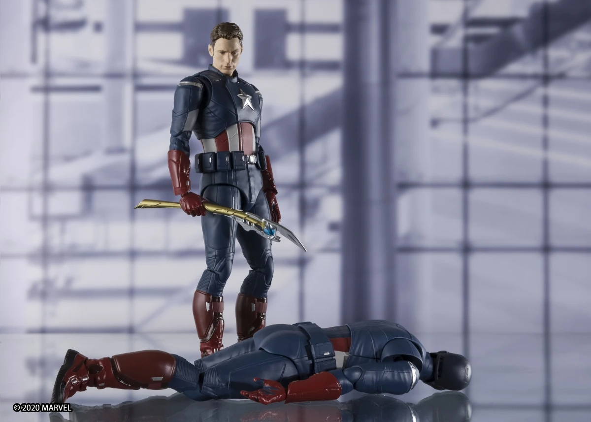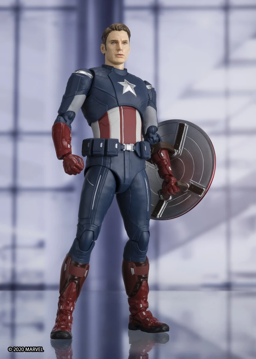 From “Avengers: End Game”, Captain America returns to S.H.Figuarts in his “Avengers” suit! In addition to the masked head, an unmasked head with two facial expressions is included. The included effect parts allow you to pose the figure as though he’s just thrown his shield! With an additional figure set, the shields can be posed as though they are clanging against each other in the scene where Cap battled himself. This set includes figure, collar with folded mask, five optional left hands, six optional right hands, locket (with right hand), shield with strap parts, shield effect parts , unmasked Steve Rogers head (with normal expression and clenched teeth expression) *Only one “S.H.Figuarts Captain America ‐ EDITION‐ (Avengers: Endgame)” included in this set. *Staff is included wtith “S.H.Figuarts Loki (Avengers)”.