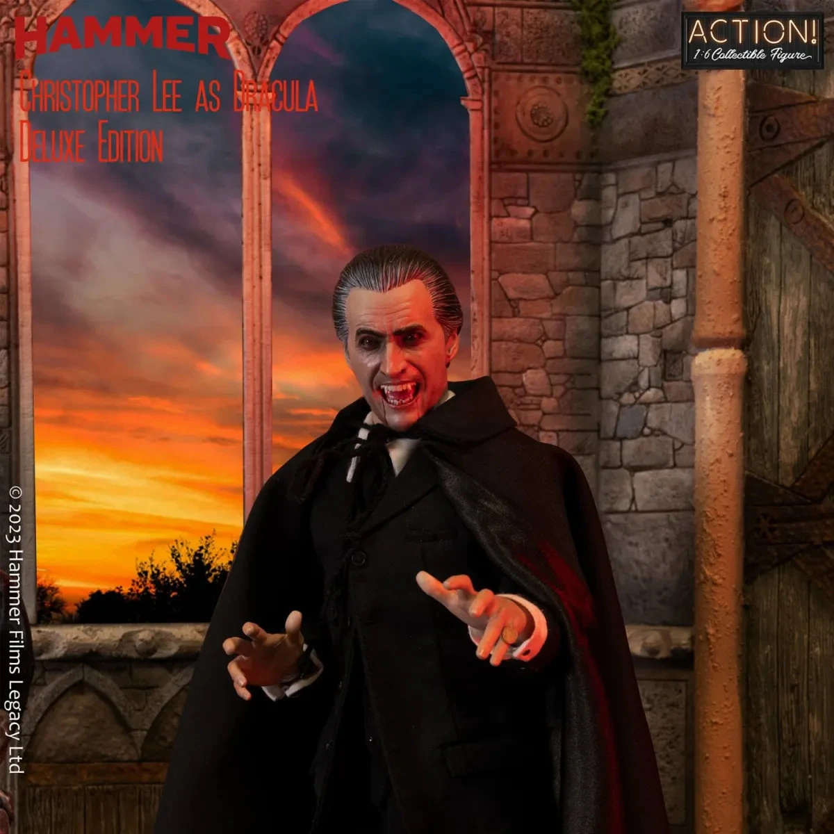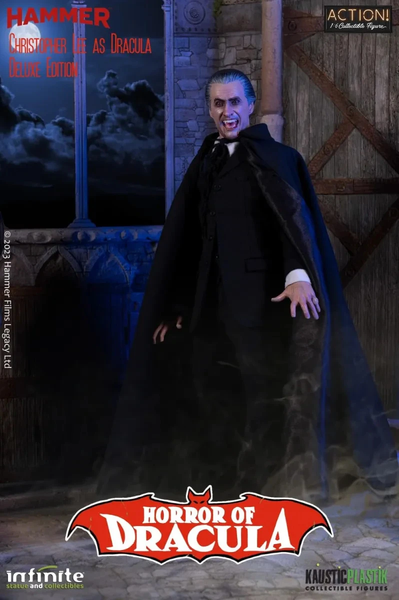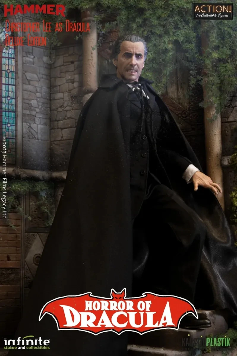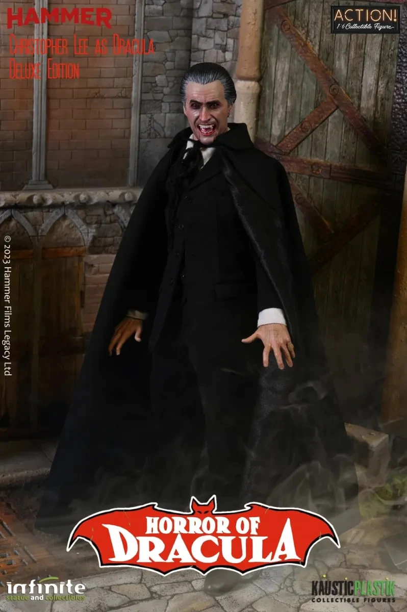 From ‘Horror of Dracula’, considered one of the best gothic-horror films of all time, the hyper-realistic action figures of Count Dracula, Christopher Lee, and the Vampire Hunter, Peter Cushing, are reinterpreted, in 1/6 scale, by Infinite and Kaustic’s artistic team, with impeccable life-like details and fabric clothes inspired by the scenes of the film. Many accessories are also included.
