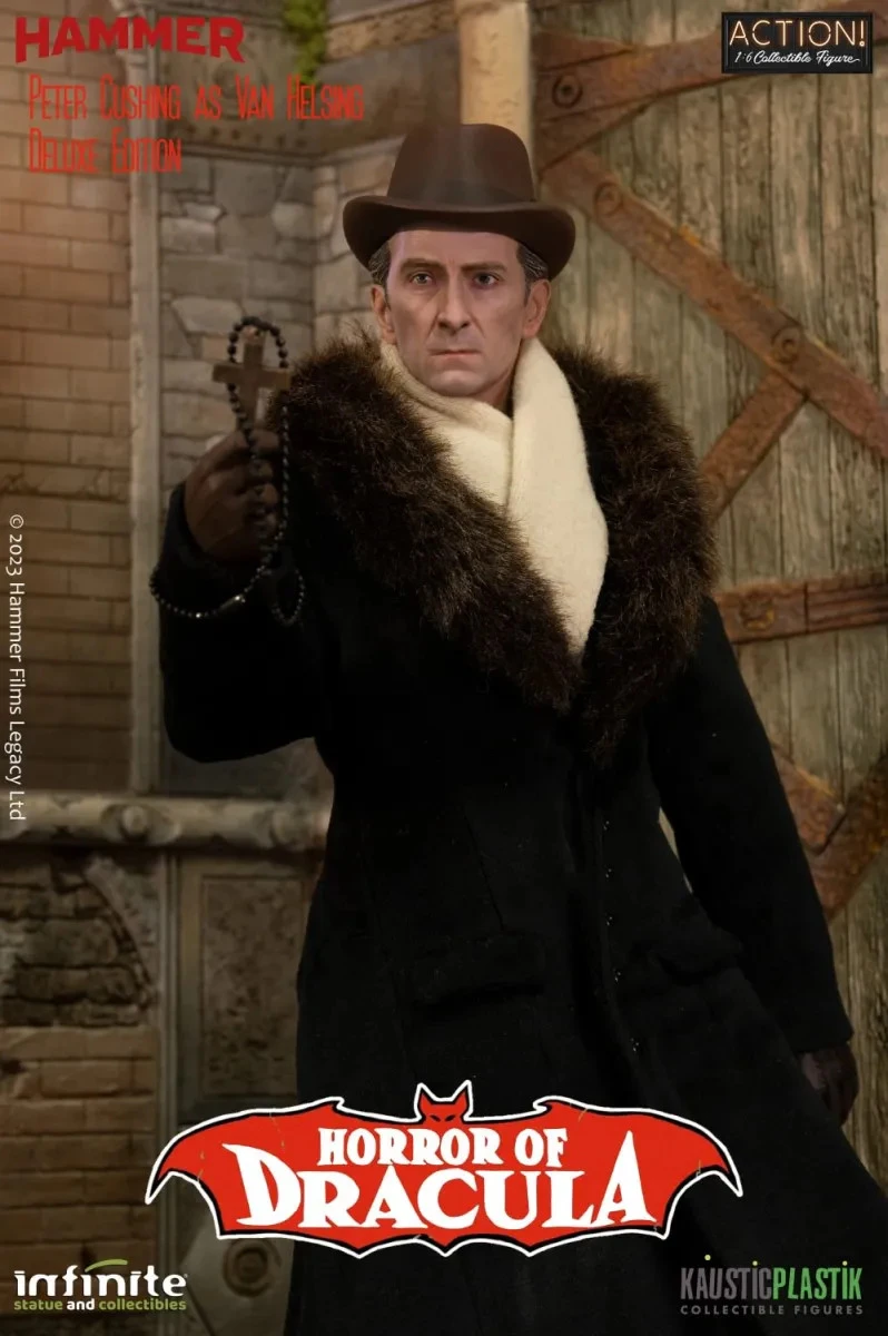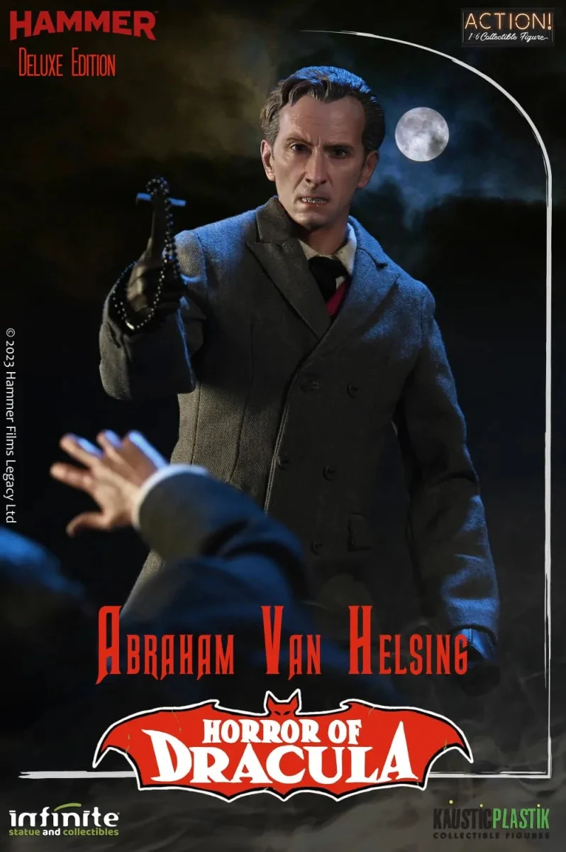 From ‘Horror of Dracula’, considered one of the best gothic-horror films of all time, the hyper-realistic action figures of Count Dracula, Christopher Lee, and the Vampire Hunter, Peter Cushing, are reinterpreted, in 1/6 scale, by Infinite and Kaustic’s artistic team, with impeccable life-like details and fabric clothes inspired by the scenes of the film. Many accessories are also included.