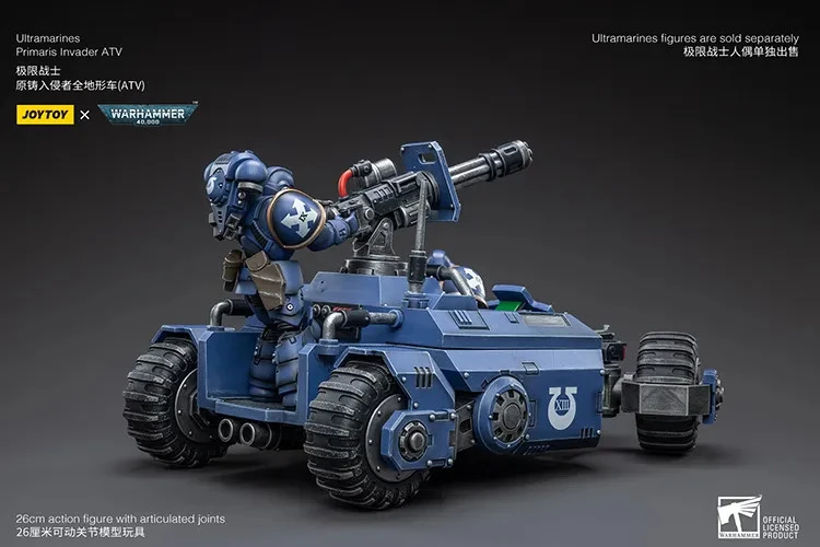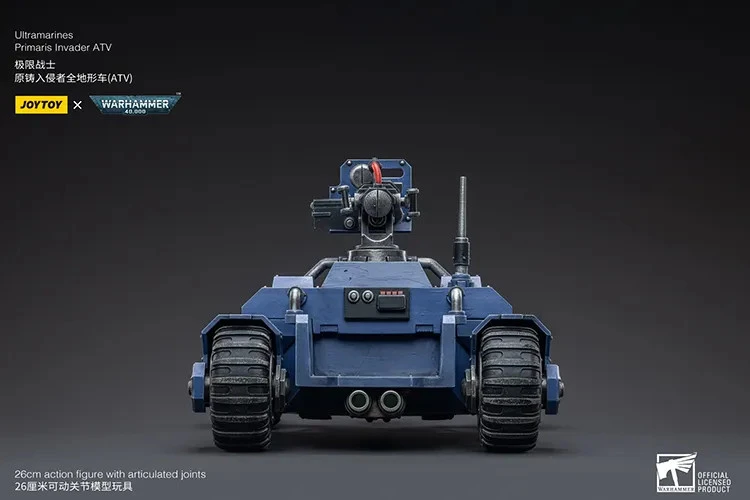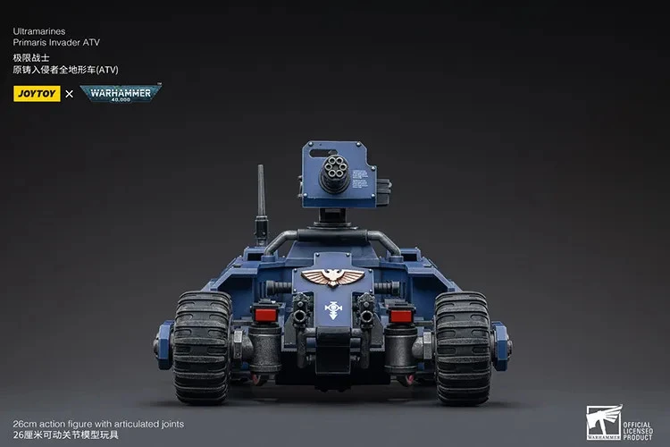 The Invader is a highly flexible all-terrain vehicle, perfectly adapted to an aggressive reconnaissance role. Outfitted with either a multi-melta or an onslaught gatling cannon, it can rapidly deliver punishing fire against vulnerable parts of the enemy line, or swiftly engage and destroy scouting elements of opposing forces. This 1/18 scale ATV from Warhammer 40k features four big tread wheels and a large turret gun affixed to the back. Highly detailed throughout and realistically weathered, the Primaris Invader ATV can carry two ultramarines (not included) as well as a number of accessories. A must have for any support team!