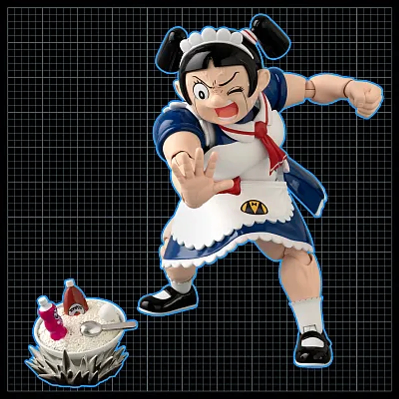 Diecast parts are used in the knees and shoulders as befits her “Steel Roboco” moniker. Facial parts and other optional parts are included as well to recreate a variety of entertaining scenes appeared in the manga.