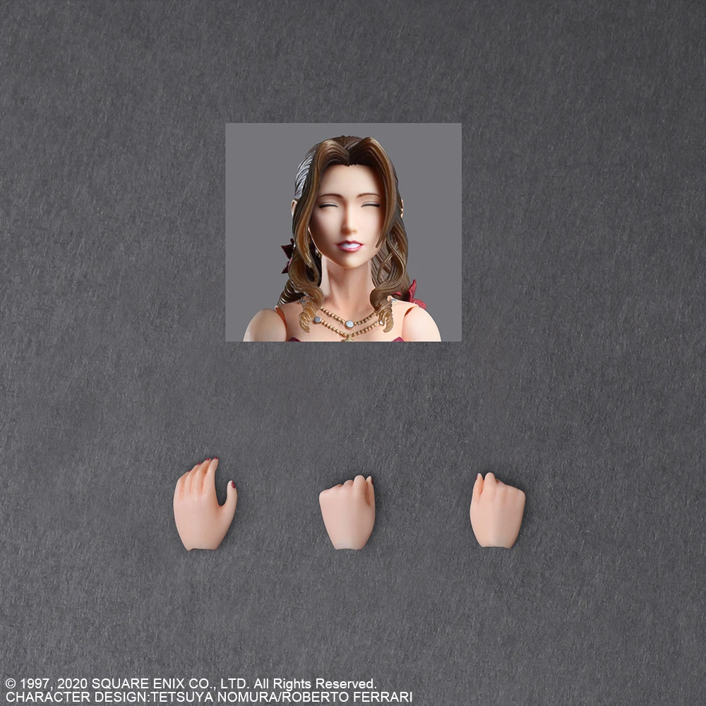 Aerith, from FINAL FANTASY VII REMAKE, makes her appearance in the PLAY ARTS KAI action figure line, clad in her extravagant red dress from the Wall Market section of the game!
